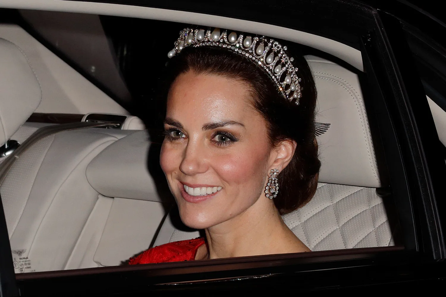 The piece was borrowed from the Queen’s collection and perfectly complimented her Alexander McQueen gown.