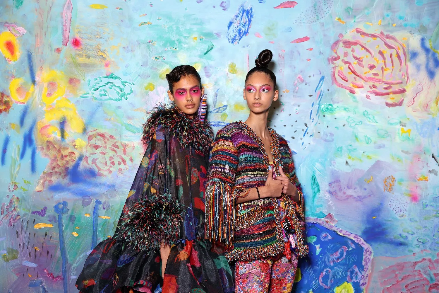 Rainbow tweeds (fashioned entirely from vintage wool, shredded silk saris and dead stock ribbons) came together with architectural gowns and dresses adorned with (fake) corral to create a ‘watery disco grotto’.