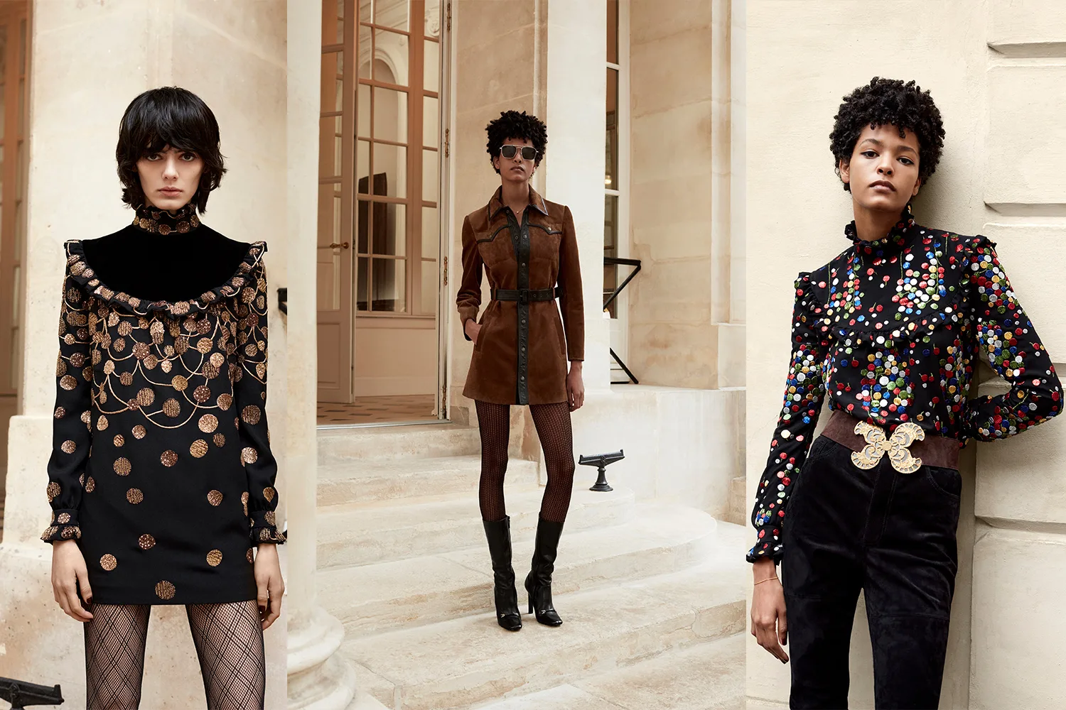 Since taking the helm at the house in 2016, Vaccarello hasn’t shied away from a statement or extravaganza; his Winter 2021 presentation earlier this year was an epic short film produced in cinematic locales, from Arctic tundras to sheer cliff faces in Iceland. No surprises that this juxtaposition of luxury against the landscape – which saw models storming through nature in metallic bodysuits, bejewelled evening jackets, feather-trimmed minis, ’60s-inspired tweed suits and lashings of jewels – was splashed all over social media.