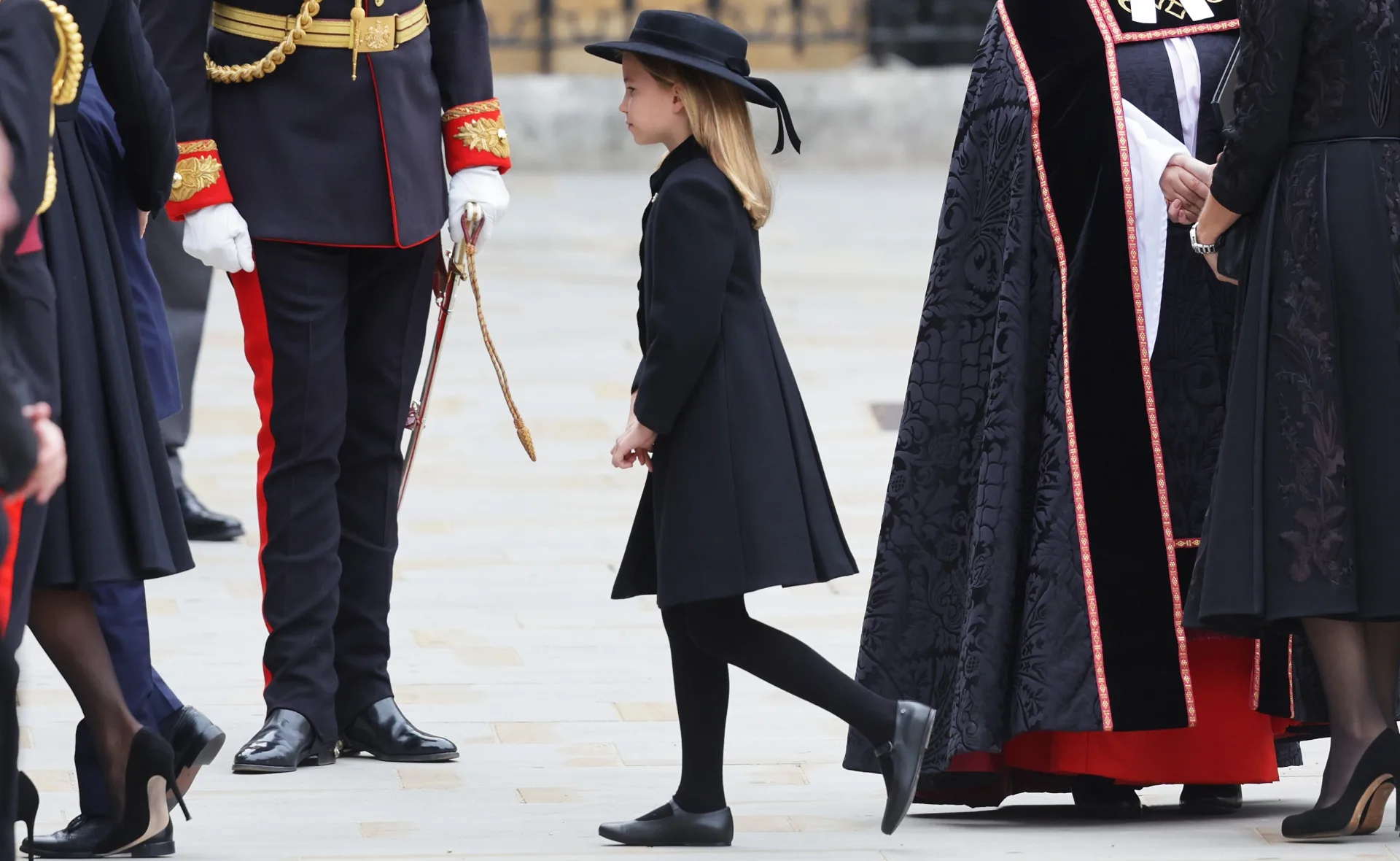 As she walked into Westminster Abbey, Charlotte was seen gripping her mum’s hand tightly. She looked sombre and respectful in an all-black outfit consisting a coat dress and a wide-brimmed hat. She wore black stockings and flat Mary-Jane shoes.