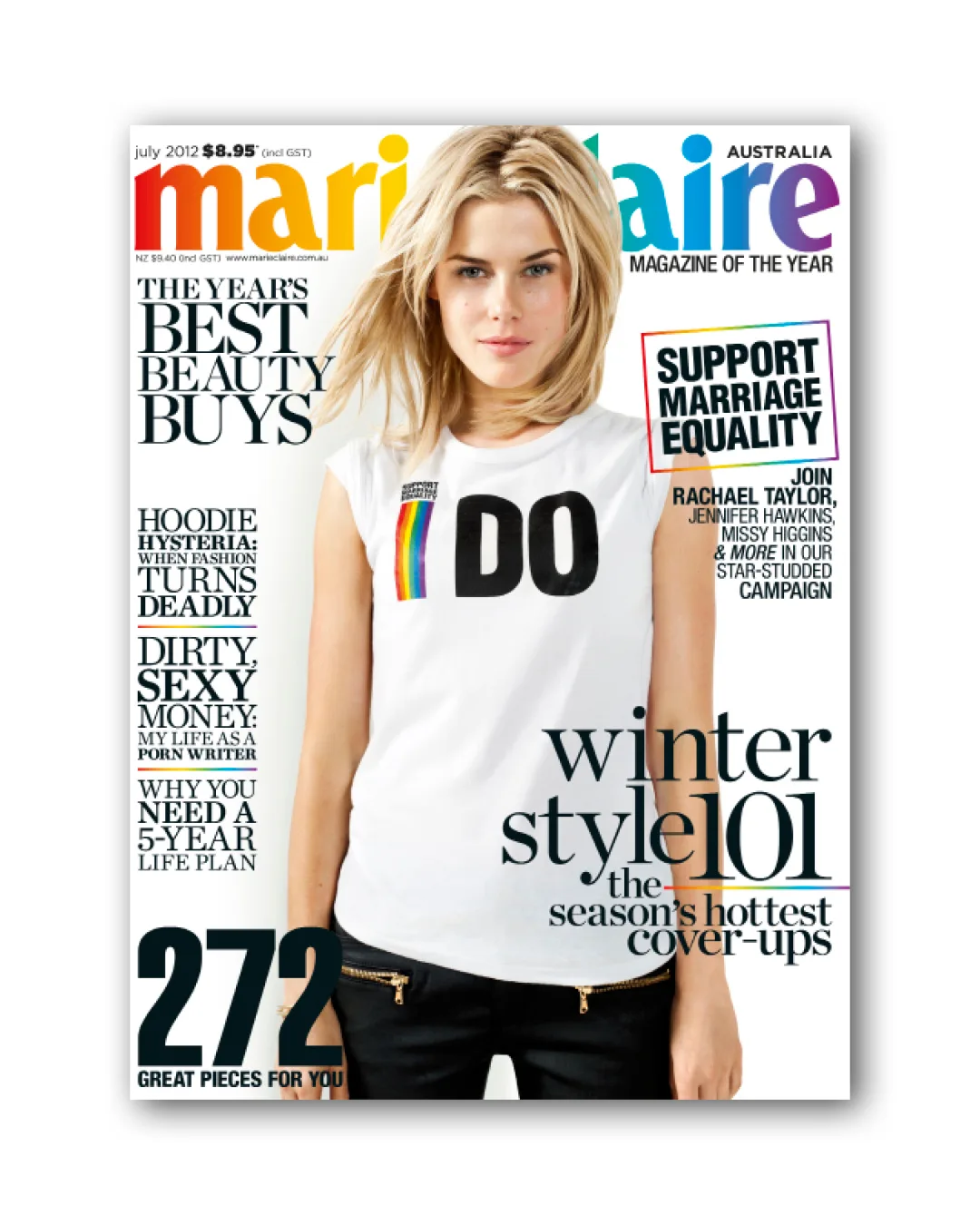 “Our ‘I Do’ campaign for marriage equality, starring Rachael Taylor, was the first time a homegrown campaign took centrestage on the cover. Even though this became an instant iconic marie claire cover it was also the cover that almost got me sacked. A lobby group had gone to all our advertisers and members of the board saying I was using marie claire as my private platform to push for change, which of course was not true. Thankfully, the board backed me and stood by us but it was very stressful. I remember crying when I heard the bill eventually passed.” Jackie Frank, editor 1995-2015